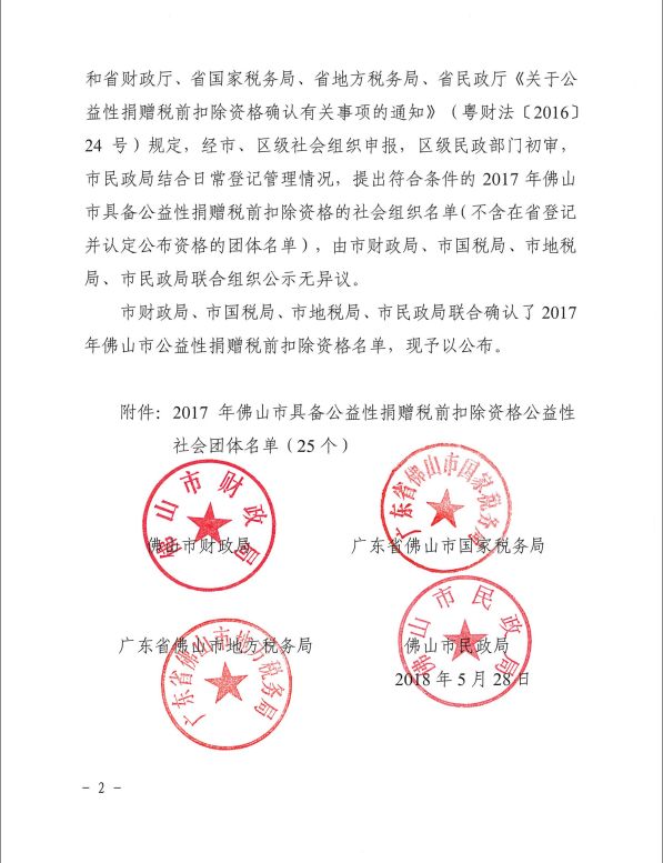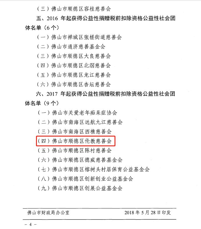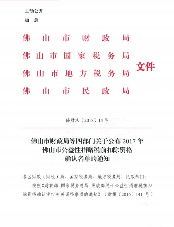 根据佛山市财政局、佛山市国家税务局、佛山市地方税务局、佛山市民政局(佛财法[2018]14号)文件,2018年5月经相关部门联合审核确定佛山市顺德区伦教慈善会获得公益性捐赠税前扣除资格!